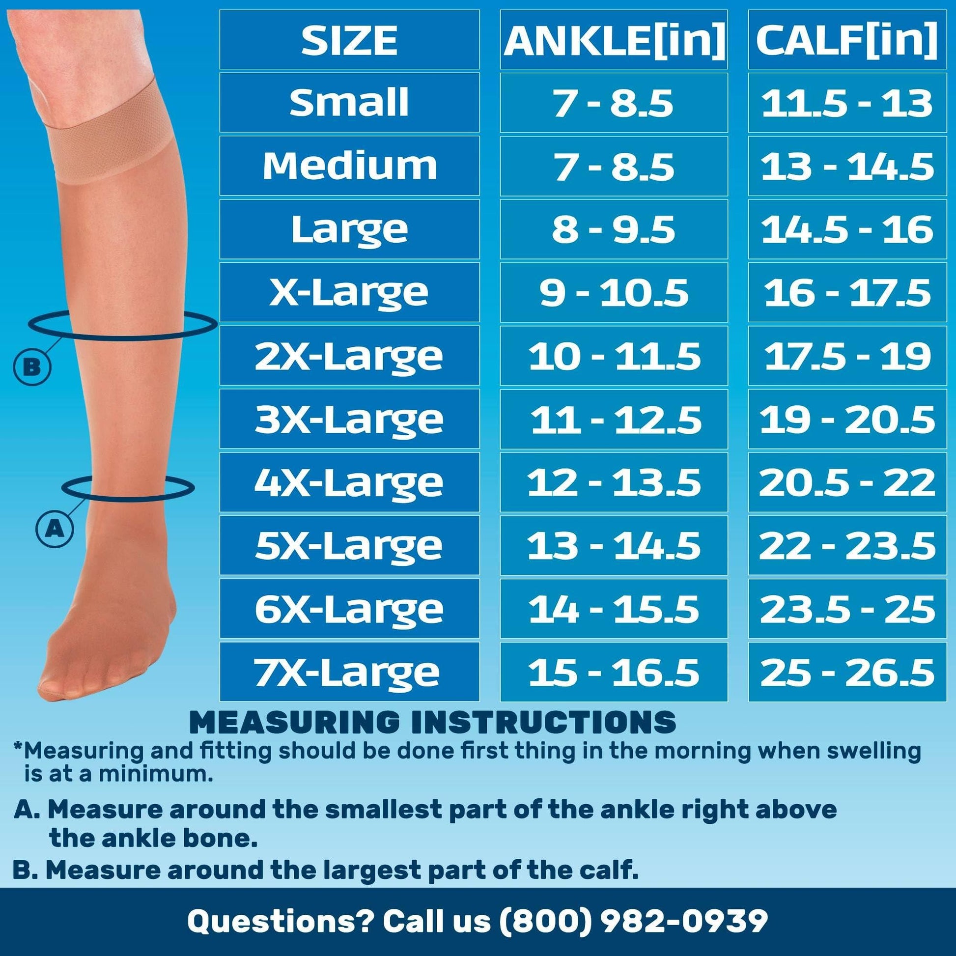 Absolute Support Sheer Medical Knee High Compression Stockings 8-15 mmHg (Model A107). These knee-high compression stockings feature a special graduated support design that not only provides mild compression but also massages the legs.