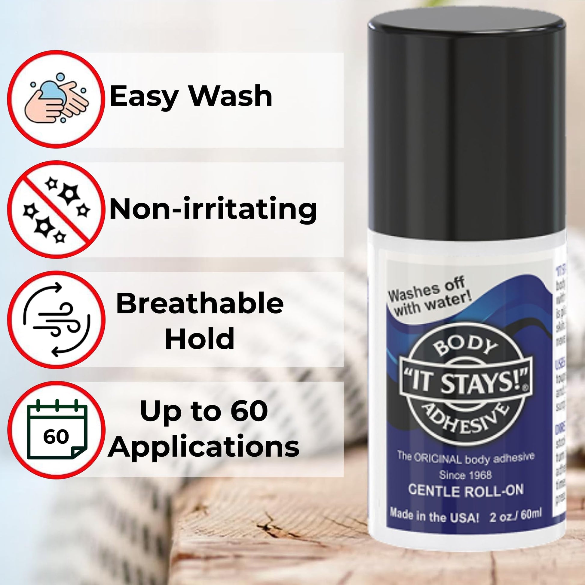 It Stays Roll On Body Adhesive by Mojo Compression Socks is a versatile, skin-safe solution to keep your stockings, knee-highs, nylons, and medical or support garments securely in place. Perfect for surgical and orthopedic belts, wigs, toupees, and theatrical makeup, it provides reliable hold without restricting movement. The flexible formula feels virtually invisible on the skin, ensuring all-day comfort. The easy-to-use roll-on applicator allows precise application, while the hypoallergenic formula prevents irritation. Washes off effortlessly without residue or odor, combining high quality with everyday practicality.