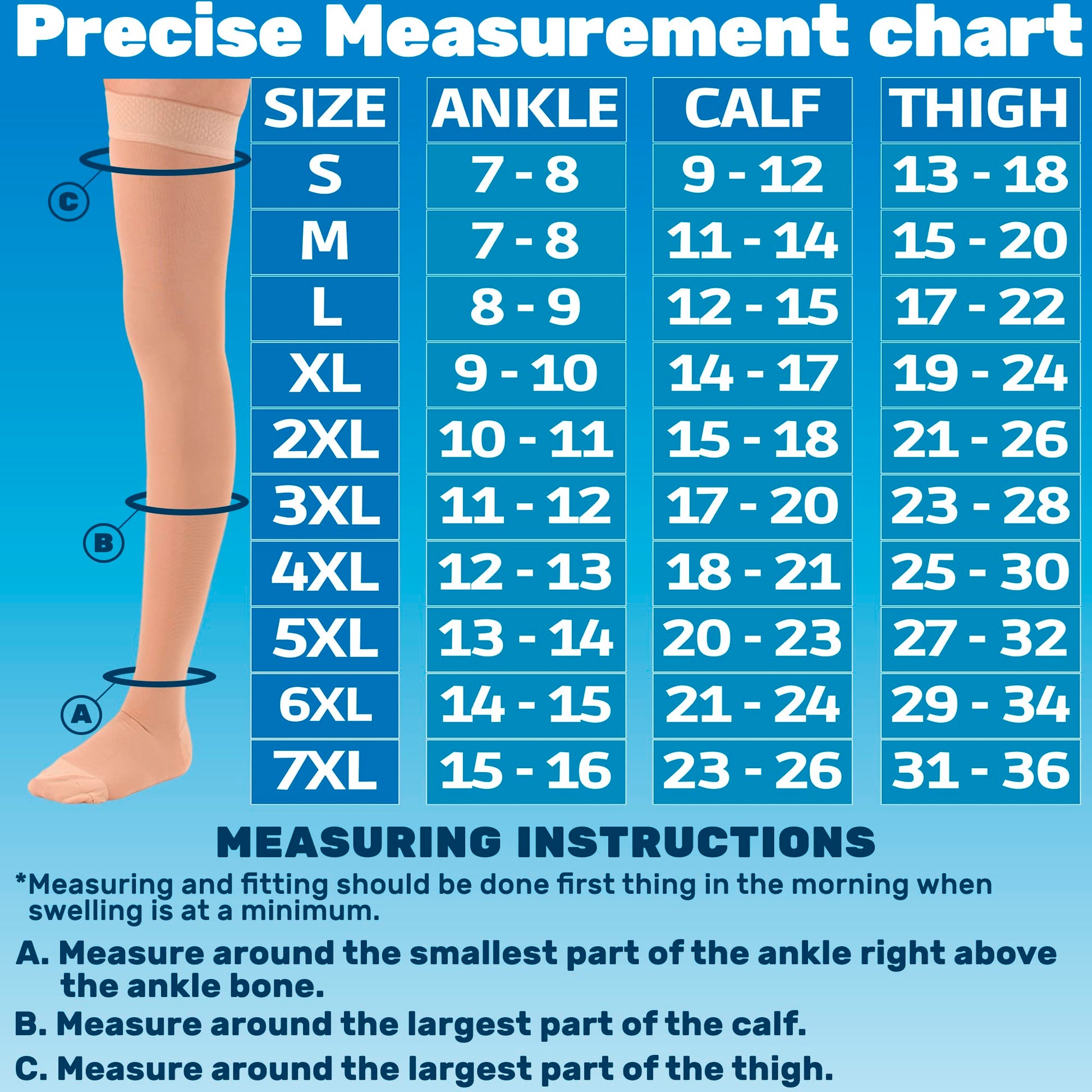 ABSOLUTE SUPPORT Thigh High Compression Socks deliver reliable, medical-grade performance with everyday comfort. Featuring a graduated 20–30 mmHg compression level, these socks are designed to support healthy blood flow, reduce swelling, and alleviate leg fatigue whether you’re on your feet all day, traveling, training, or recovering.