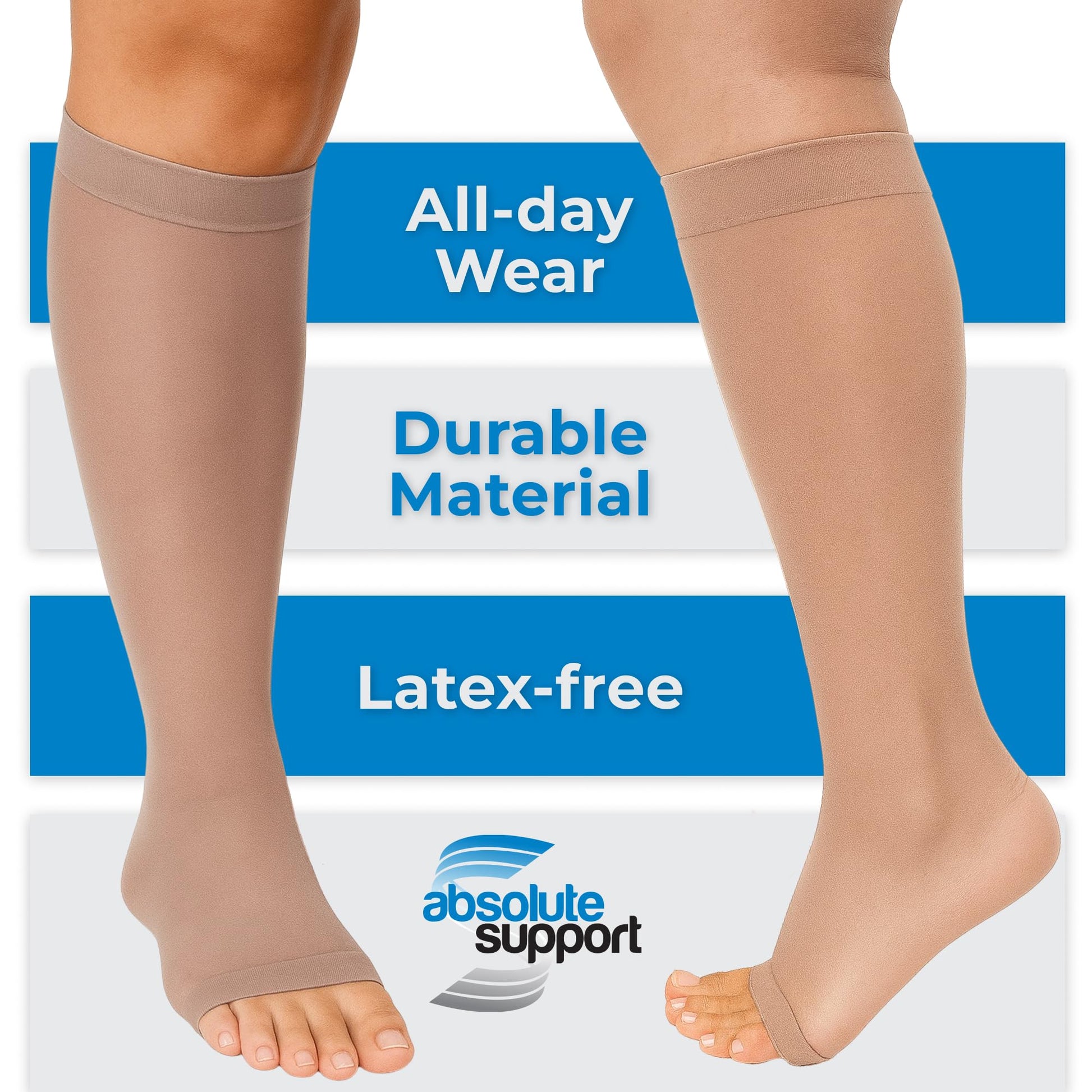 These Absolute Support women’s knee-high open toe compression socks deliver firm, clinically trusted 20–30mmHg graduated compression designed to encourage healthy circulation and help reduce swelling. Ideal for long flights, extended sitting, or daily wear, they offer targeted support that helps keep legs feeling energized and comfortable.