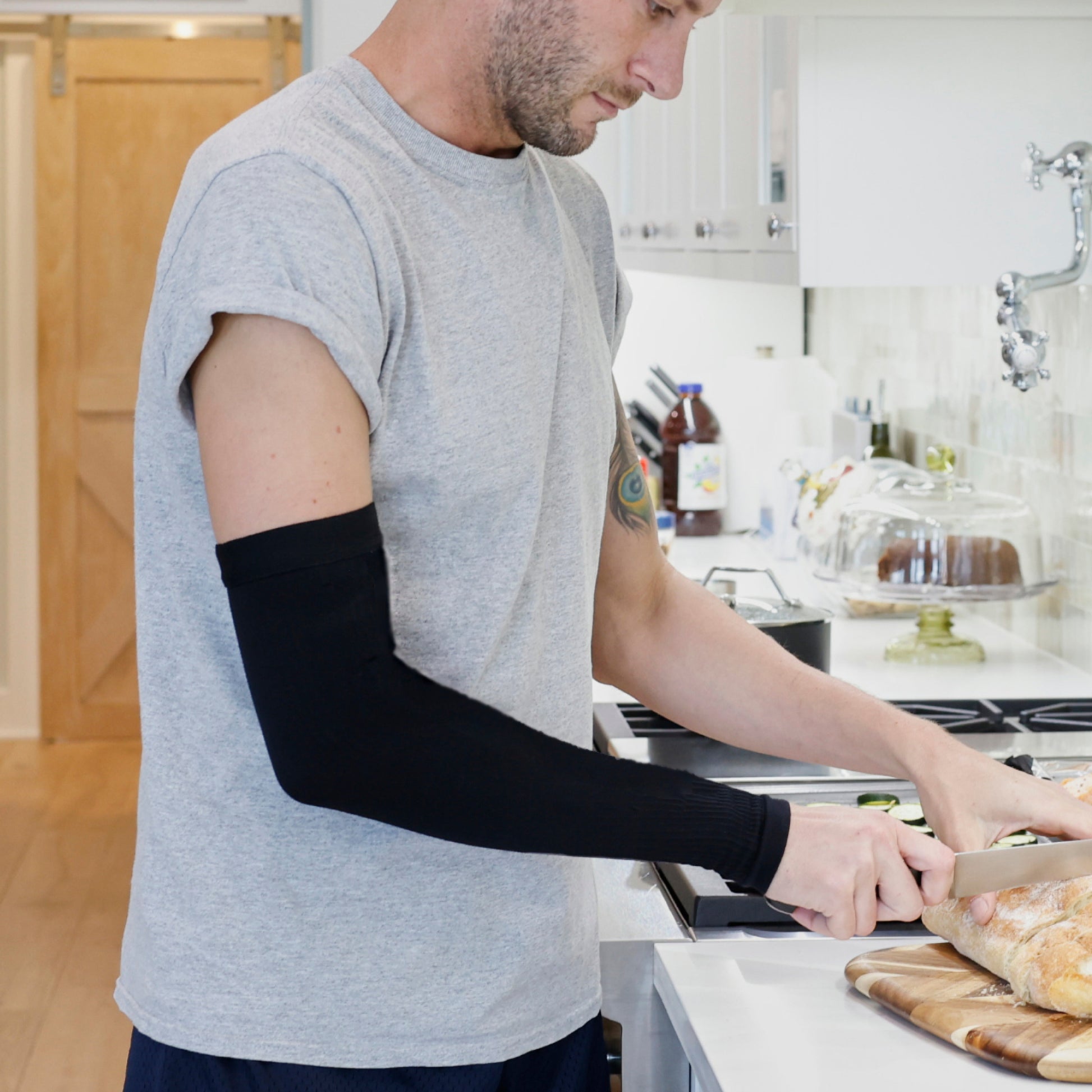 - Built in 1.5 inch soft, silicone top band prevents rolling and provides superior comfort for all-day wear. Wear a compression garment when exercising the affected limb to help with edema swelling, cellulitis moderate to heavy, arm pain, arthritis, tendonitis and post surgery.