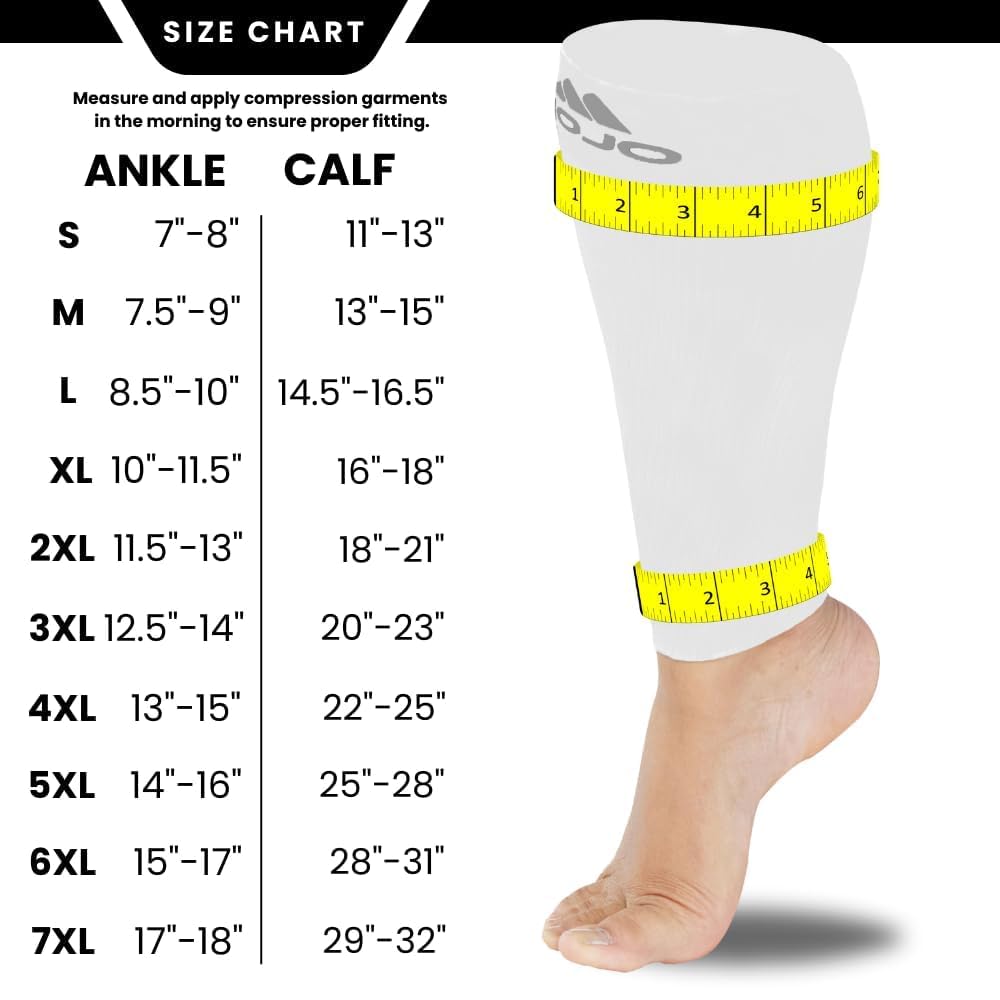 Mojo Extra Wide Plus Size Calf Compression Sleeves deliver 20-30 mmHg graduated compression to support circulation, reduce swelling, and relieve leg fatigue. Designed for larger calves, these sleeves provide a comfortable fit without sacrificing style or effectiveness. Ideal for daily wear, travel, sports, or recovery, they help improve energy levels and support tired legs. Made from a durable blend of Nylon and Lycra Spandex, these sleeves ensure long-lasting performance while maintaining comfort. Available in multiple vibrant colors and sizes up to 7X-Large, Mojo Compression Sleeves combine fashion, function, and proven leg health support.
